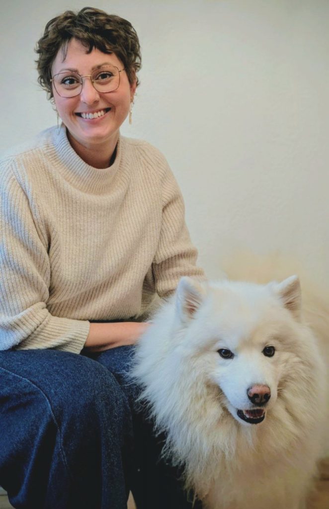 Gelegentlich wird sie von ihrem Therapiebegleithund „Alfons“ in ihrer Arbeit unterstützt.